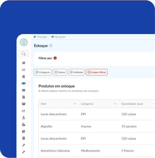 Controle e monitore o estoque de materiais e insumos em tempo real, evitando desperdícios e garantindo que sua clínica esteja sempre abastecida.